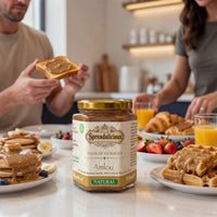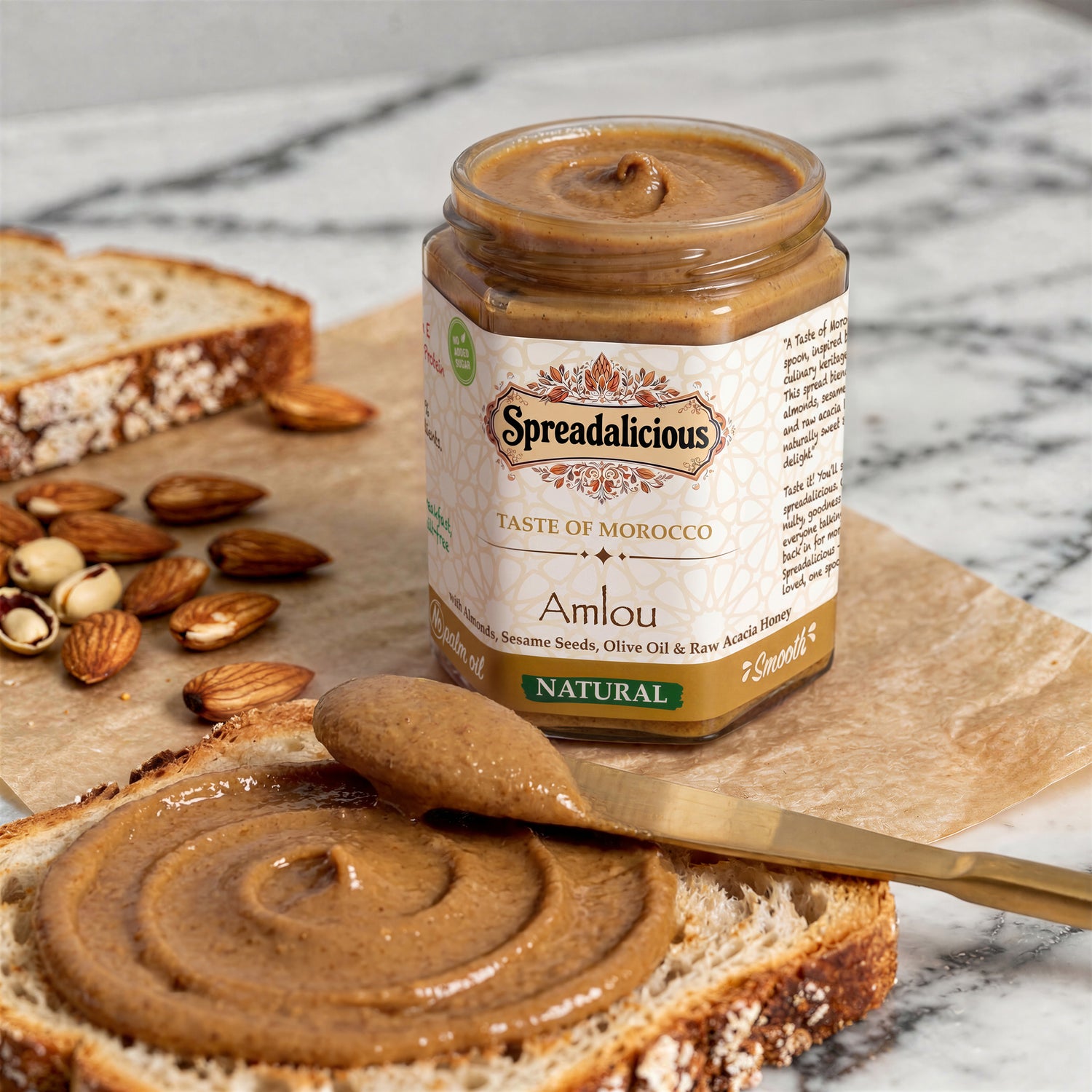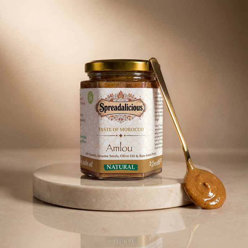 Indulge in the rich, authentic taste of Morocco with Spreadalicious, a premium blend of roasted almonds, golden sesame seeds, raw acacia honey, and a touch of extra virgin olive oil. Crafted in small batches with the finest ingredients, this smooth and nutty spread is naturally delicious and completely free from additives or preservatives.